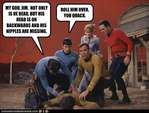 MY GOD, JIM. NOT ONLY IS HE DEAD, BUT HIS HEAD IS ON BACKWARDS AND HIS NIPPLES ARE MISSING.