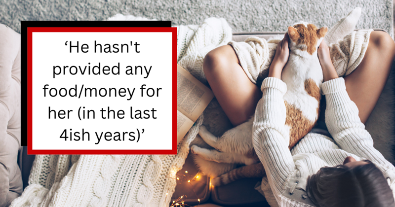 cat lying on a woman's lap including 'He hasn't provided any food/money for her (in the last 4ish years)'