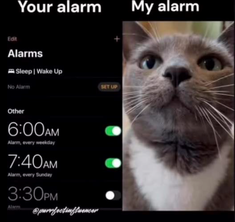 No matter how loud the alarm, cats remain wrathful and undisturbed. Hoomans cannot wake them. Those fur babies reign supreme over sleep, and any attempt at disturbance is met with furry fury.