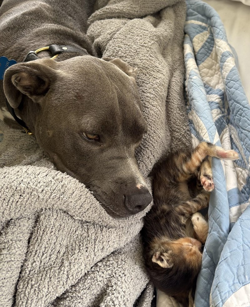 This look says everything. Yes, well, the little one might be in the middle of a zoomies session, but the Pitbull's look of full attention and pure gentleness says everything. We think these two are going to have the best BFF life. Such joy.