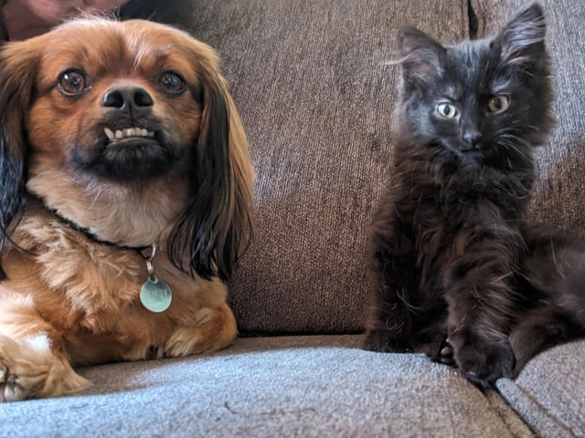 We can only imagine that this cute kitten wanted to be just like her fluffy and floppy eared older brother. Prompting her to put the blanket over her head in the hopes of passing a look-a-like check. And while she might not pass, we most certainly give her points for trying.