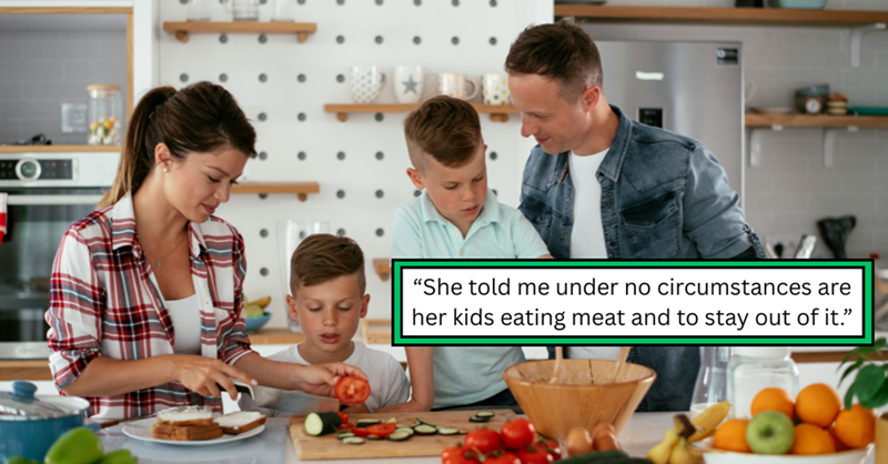 12-year-old stepson admits he is tired of being a vegetarian after having been raised meat-free, so his stepdad encourages him to change his diet but his biological vegetarian mom forbids him: ‘[He] still really wants to eat meat’