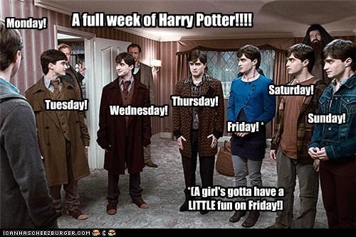 A full week of Harry Potter!!!! Monday! Tuesday! Wednesday! Thursday! Friday! (A girl's gotta have a little fun on Friday) Saturday! Sunday! (Daniel Radcliffe)