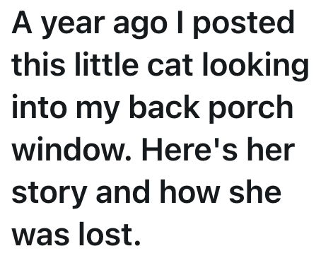 Cats are highly regarded for their independence, but this cat takes things to another level. After being disgruntled with her current family, she decided to break free of her indoor cat shackles and depart on a solo journey into the wild. After surviving a year on the outside, she found her way home... This time, for good. Perhaps cats really do know what's best for them! At least, this cat certainly does.