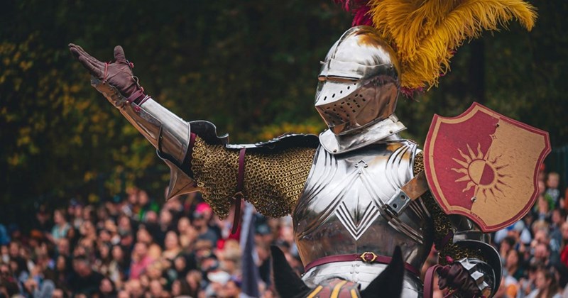 A man dressed in armor and holding a shield at a Renaissance Faire