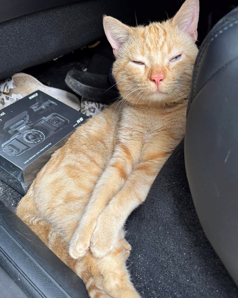 Flirtatious feline uses his singular brain cell to enchant passing boyfriend, he takes the orange kitty home and convinces girlfriend to adopt him as well: 'I have no idea on Earth how this guy survived in the streets'