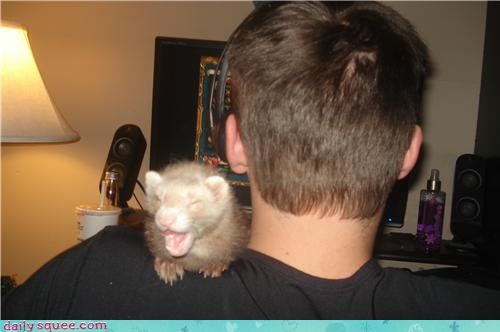 Our Submitter says: "This is my youngest ferret, just chilling out on my shoulder being my good luck charm."