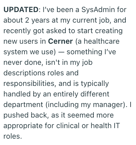 This Junior SysAdmin had been quietly taking on extra work and responsibilities for two years without receiving any recognition or extra compensation. They were asked to take on the task of creating new users in the company's administration system. Their boss protested, giving the usual clichéd arguments your boss makes when they want you to do something but know they don't have a leg to stand on: "the last [your role] did it," "we're a team," before running to HR when the worker still wouldn't acquiesce to taking on yet another task.