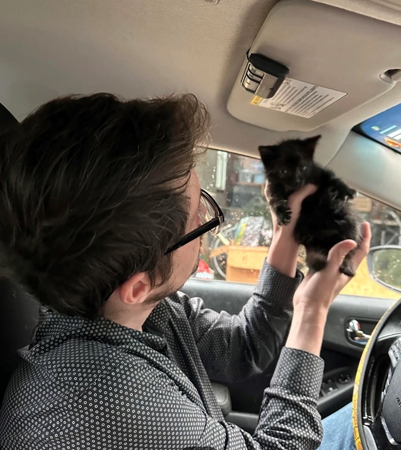 Driver rescues a kitten running through traffic in the pouring rain, saving him from getting hit by two cars, then adopts the fluffy cat child into his loving family