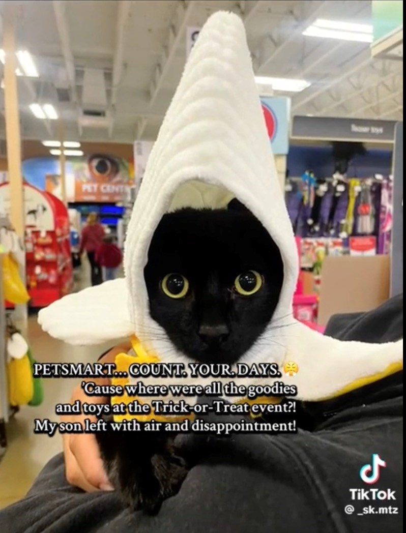 Our kitty would love to go trick-or-treating in a costume. This year, she's a mad scientist, complete with a beaker filled with meowsterious liquid and glasses. She would win best-dressed… maybe that's the reason why they don't want cats? They just know cat costumes are better than dog costumes.