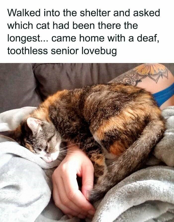 This is the kind of adoption story that always hits us a little harder. It's so, so difficult for senior kitties to get adopted, and that is not right. Them being senior does not make them worse pets. In fact, sometimes, they are even cuddlier and more content when finally finding their home at an older age. Adopt senior, people, it's so worth it.