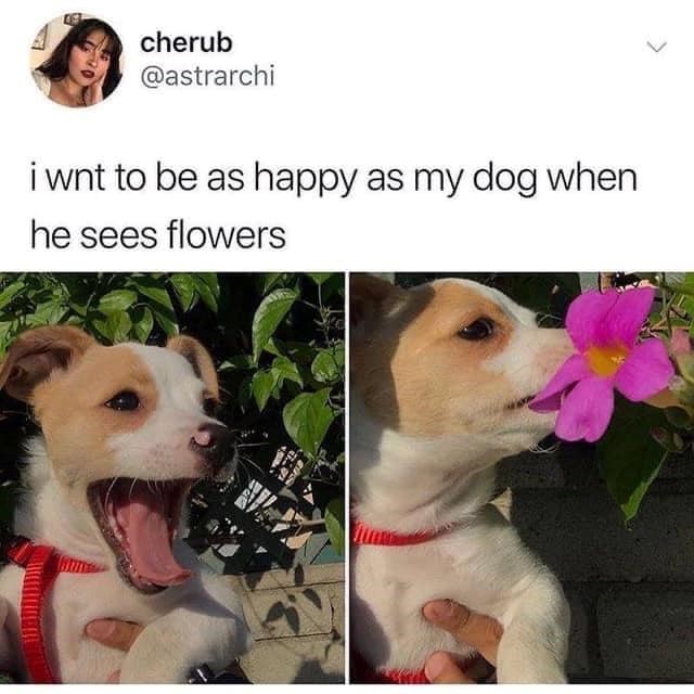 Well, great. Now we want to be as happy as this person's dog when they see flowers. We think we need a dog by our side. And some flowers. And preferably more dogs, just in case.