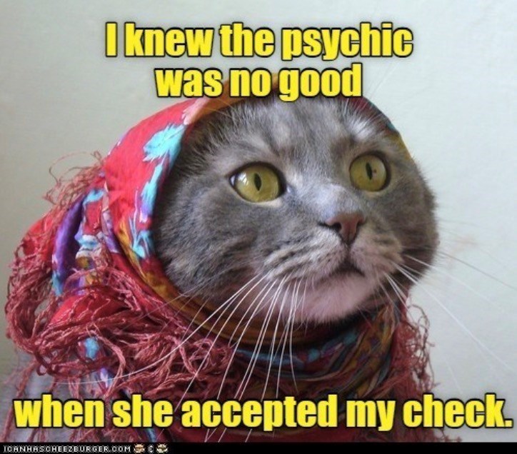 She should have seen that coming! Well, the joke's on her, then. We got a fake psychic reading, and she got a fake check. Sounds purrfectly fair to us!