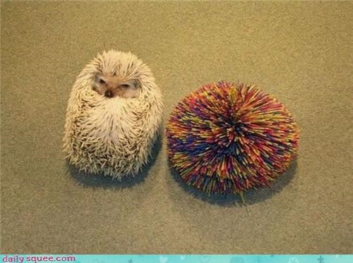 Awww what a squeedorable juxtaposition! ... but in all serious, which is the hedgehog and which is the kooshball??? :( -Sally Squeeps
