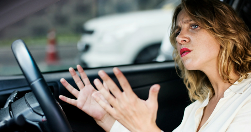 • an woman sat at the steering wheel of a car gestures in frustration