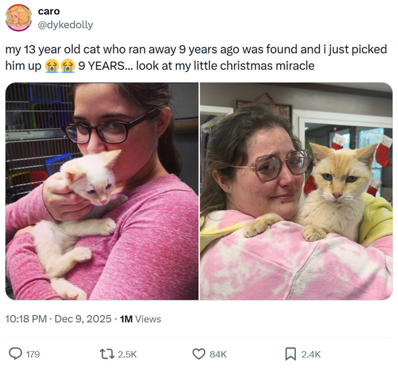 We don't know what's worse, the cat surviving on its own outside for so many years or this. Either way, we cannot be happier about him being back with the owner that he is supposed to have. A Christmas miracle indeed.