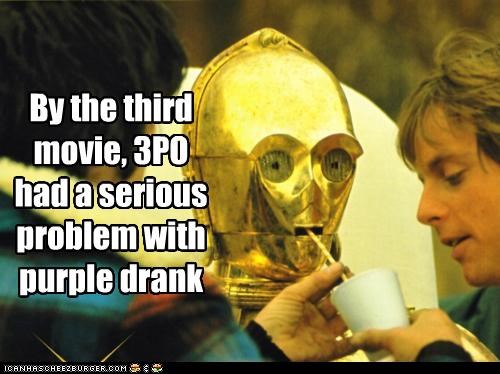 By the third movie, 3PO had a serious problem with purple drank (Star Wars)