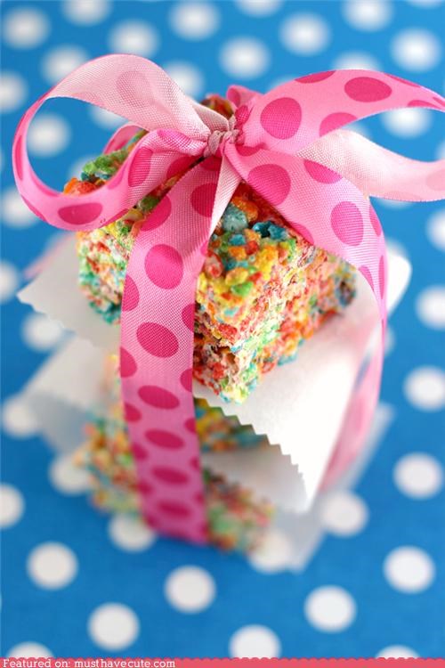 Butter, marshmallow fluff, Rice Krispies. How could you possibly make this recipe more satisfying? Rainbows! Fruity Pebbles! I'm sure you'll all say, "Duh Ingo!" but I honestly never thought of this. Genius. I need to go to the store to stock up on cereal now. Brb.