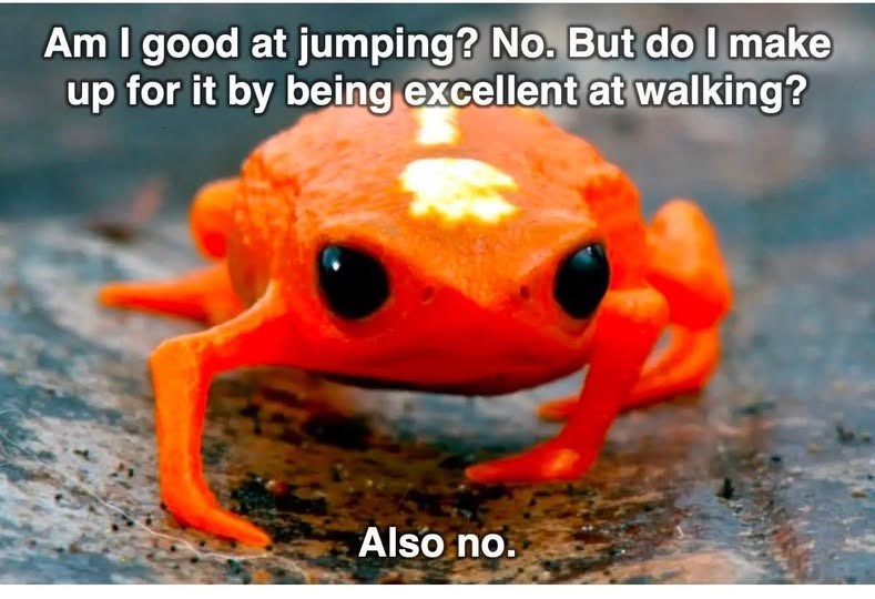 Science has gently revealed that pumpkin toadlets - those tiny, neon-orange frogs who look like walking highlighters - are, bless their hearts, not very good at jumping. Unlike most frogs, which are basically spring-loaded pogo champions, pumpkin toadlets tend to launch themselves with great confidence and then… immediately flop. Researchers believe this is partly because their inner ear structures, which help with balance and spatial awareness, are underdeveloped compared to those of other frogs.