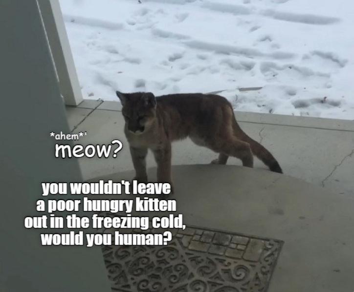 You know what? We would 100% fall for this. Not because we would confuse this mountain lion with a stray cat, but because our desire to have a mountain lion as a pet is too strong to resist. We know we're not supposed to. We know they're wild animals. But think of the cuteness of their giant paws. Think of the snuggles. Think of the ridiculousness of their airplane ears. No! We can't. Big cats are not pets. Big cats are not pets. Be stronger than us, resist.
