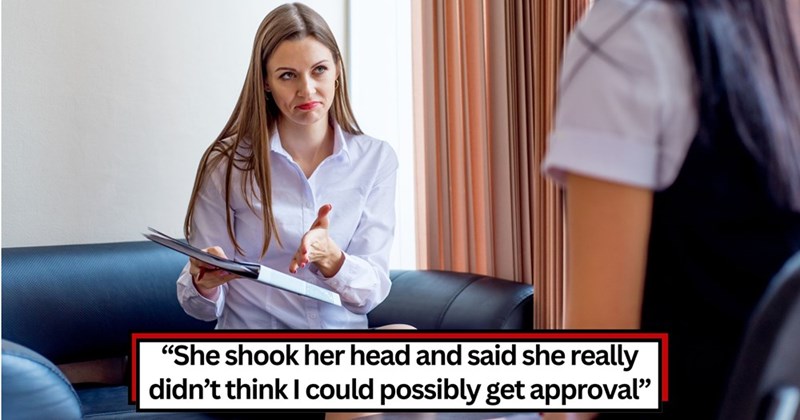 Woman in a white shirt gestures dismissively while holding documents, in an office or bank setting with on-image quote saying she didn’t think approval was possible.