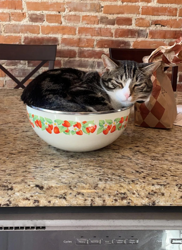 If we're being honest, it's the pawrents' fault for leaving so many items on the counter that are purrfect for cats to lie on. Cats love small, enclosed spaces, so anything like a bowl, bag, or box is basically an invitation for a cat to loaf on it. These spaces make them feel safe and protected, so while they're technically not on the counter, they're basically giving this cat the most pawsitively enjoyable loopholes it could ever ask for.