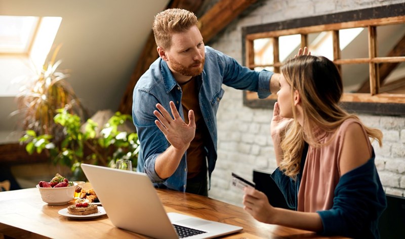• Couple at a kitchen table with a laptop, man gesturing with raised hands as woman holds a credit card during a serious conversation.