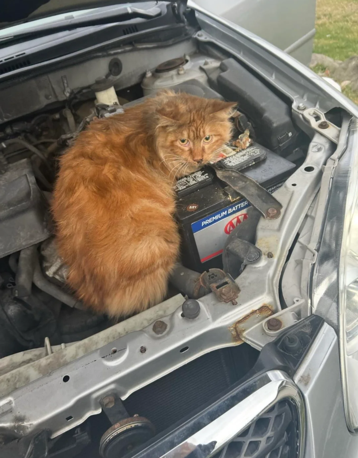 Wool_Lace_Knit How did such a big cat manage to get into a small engine compartment?