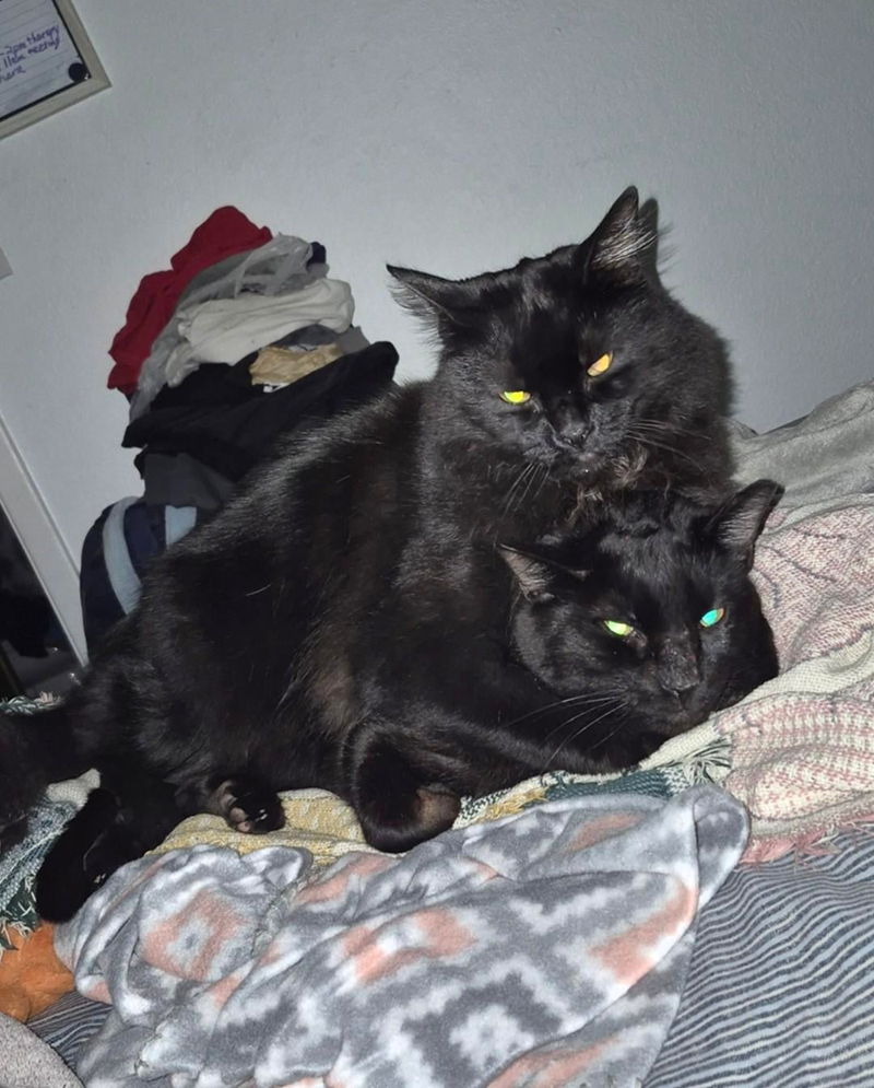 She has since passed away and I was heartbroken. Then soon after, an inseparable pair of black cats repeatedly showed up on my porch and tried to break in. I felt bad and let them in. They never left and they have to cuddle every night to go to sleep.