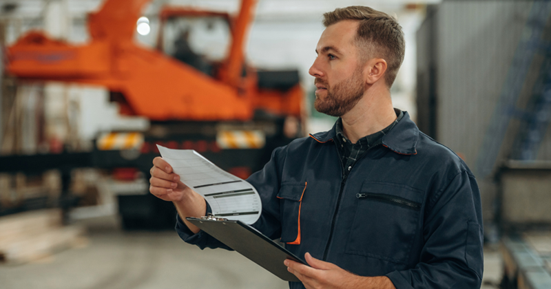 • Male warehouse foreman looking at his paperwork on the job.
