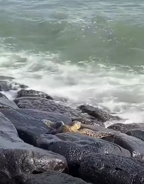 Sea turtle gets stuck between rocks right at ocean's coastline, brave surfer comes and gets the turtle out of the rocks so it can happily swim away