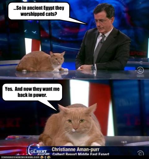 ...So in ancient Egypt they worshipped cats? Yes. And now they want me back in power. (Stephen Colbert, Christianne Aman-purr)