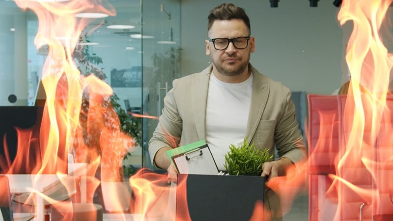 Flames surround an employee who walks defiantly out of the office carrying the contents of his desk in a box.