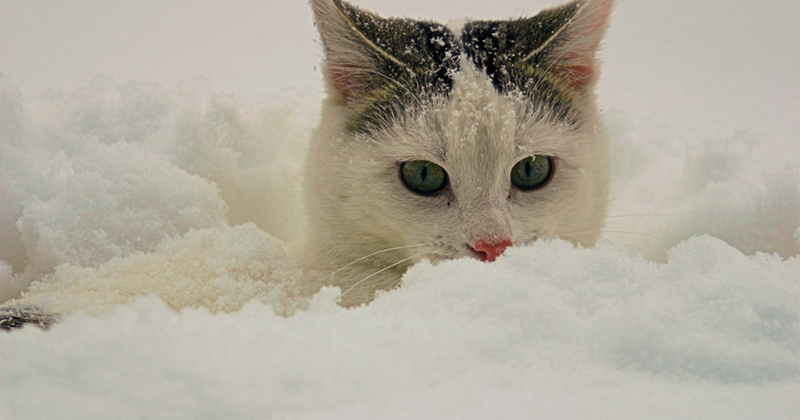White cat in snow.