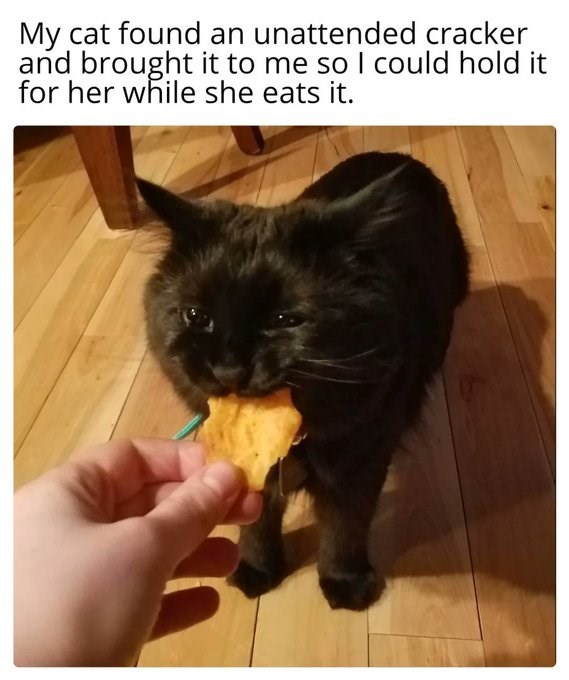 My cat found an unattended cracker and brought it to me so I could hold it for her while she eats it.