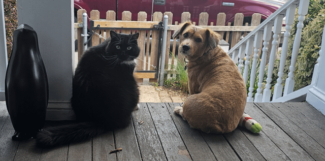 This has got such a vibe of a pair of young kids hanging out feeling like they are all grown up talking about the trials and tribulations of the world when one of their moms comes up and asks a really patronizing question. Now, sure the question is actually quite legitimate as neither of these cuties know how to cut up their own steak, but nonetheless the adult-like conversation they were having made them feel like they are independent adults whether or not they actually are. The cat looks especially perturbed by this intrusion, the dog looks like it can only think about the mention of steak.