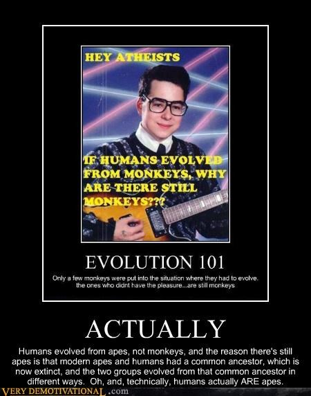 humans evolved from apes, not monkeys, and the reason there's still apes is that modern apes and humans has a common ancestor, which is now extinct, and the two other groups evolved from that common ancestor in different ways. Oh, and technically, humans actually are apes.
