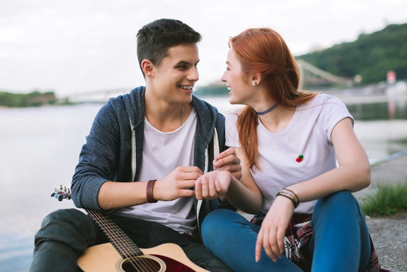 Teen couple sit together and smile at each other.