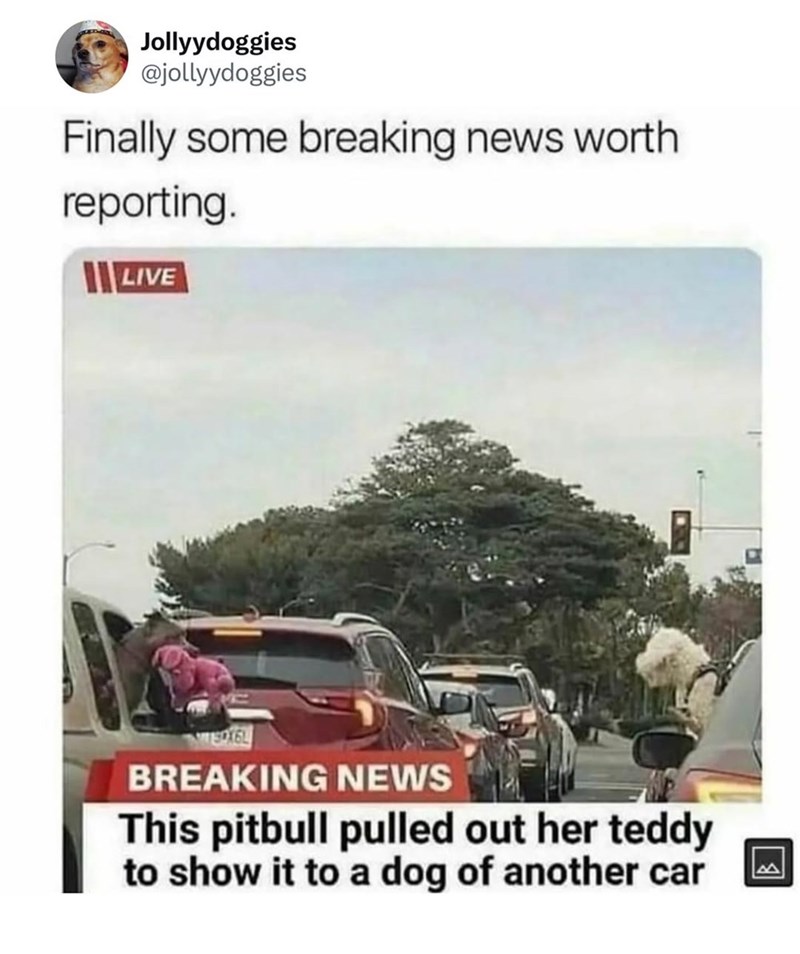 Well, with all the terrible news clogging our minds with junk, this is just the kind of news we needed to remind us of the good in the world. Because if we live in a world where a dog can be so infatuated with its teddy that she has the compulsion to show it to another dog, all while waiting in traffic. You have to believe that something is going right in the world to allow for this to happen. It means life is safe enough, puppers feel supported and loved, and that there is enough time in this life to stop and share a little joy, even if it is between puppers.