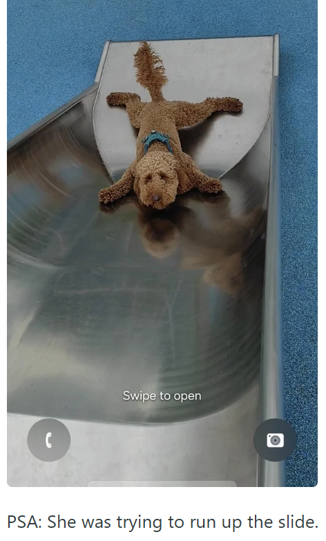 Dogs are just wonderful for the fact that they never lose their innocence. It does not matter how old they grow, they never become jaded and never stop believing that they can do anything they set their minds to. Even when, as in this photo, physics has most certainly put them in their place. It stems from a tenacity, a vigor that many of us hoomans would do rather well to learn to adopt, because only if we place limitations upon the world around us will it stop us from doing what we deem impossible. That being said, this dog is never getting up that slide…