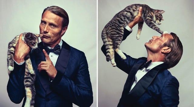 Now this one we were both delighted to see and also a little disappointed at the same time. Mainly because Mads Mikkelsen has spent much of his career playing the bad guy, the villain and most notably perhaps one of James Bond’s most fierce enemies. Which would make him the purrfect typecast to be a supervillain who owns a cat who is just as evil as he is. But that is not fair at all to cat kind who have had to fend off their evil and sinister reputation since the days of the witches. Not that it is not totally true that they have a little evil streak, but it hurts the feline image if that is all that people think of them…