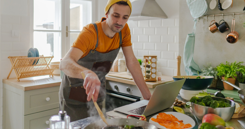 Guy cooking. new recipe for the first time.