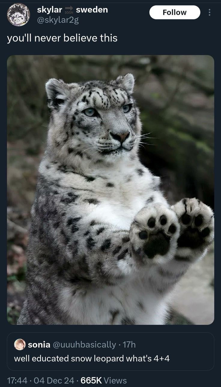 We have yet to see a single picture of a snow leopard that didn't bring us joy. And this purrfectly intelligent kitty certainly won't be the first. He knows his mathematics and he's fluffy to boot. Can you ask for any other way to start your Caturday? You can, but we're pretty sure it can't get any better than this. The only thing that would be cuter than him would be a snow leopard kitten, and if you're really desperate for one of those, you should check out our unlimited source of cute baby animals.
