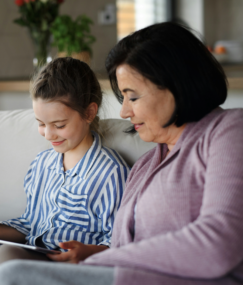 A grandmother in a purple sweater smiles while looking at a tablet with her granddaughter.
