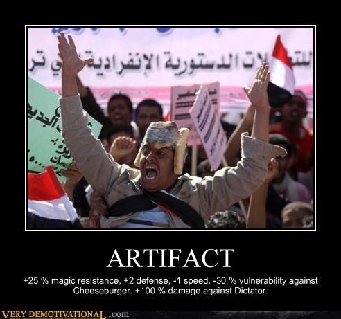 ARTIFACT +25% magic resistance, +2 defense, -1 speed, -30% vulnerability against cheeseburger, +100% damage against dictator.