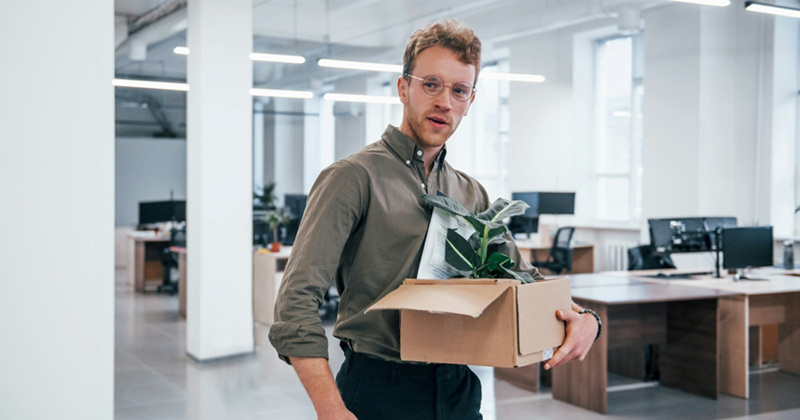 An office worker walks through an office, holding a cardboard box with belongings, including a plant, inside it