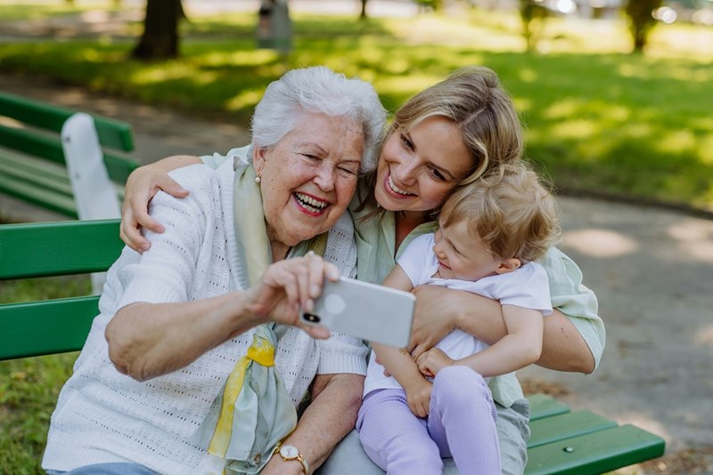 Woman holds toddler while taking selfie with her mother-in-law at a park.