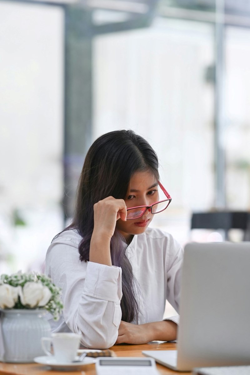 A young female employee looks down her glasses while sitting at her desk with an open laptop