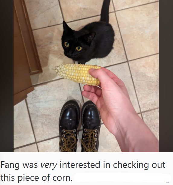 Cats man. Their wills and wants in this world are truly inexplicable. One day they want to consume a whole head of tuna. The next, all they want is to inspect and indulge in an ear of corn. Who knows what other wacky surprises this cat child will have in store for his pawrent. Though surprises might be the wrong word considering there is nothing that will be all too surprising after showing a deep interest in corn. Not even cooked corn or corn in the can, just a raw piece of corn on the cob. The only rational explanation is that this cat might have been a corn farmer in a former life…