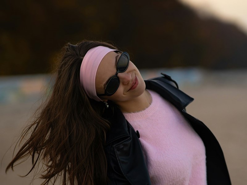 A young wealthy woman tosses her hair in the wind, wearing sunglasses.